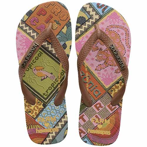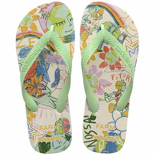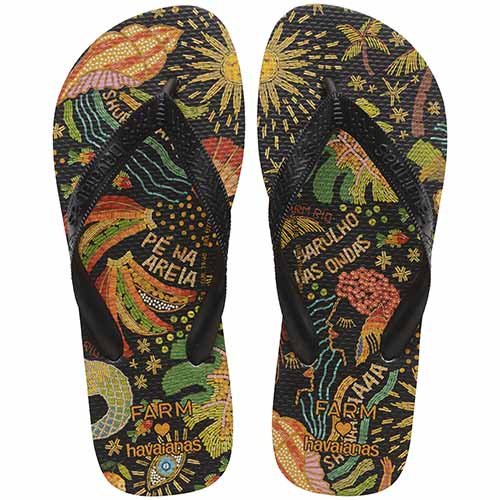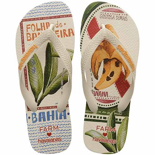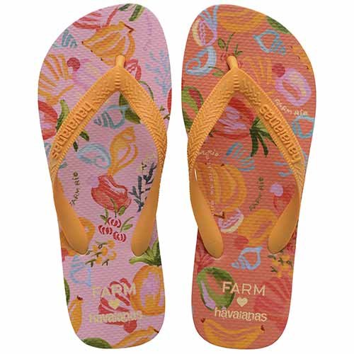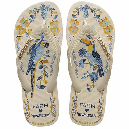 Havaianas e Farm apresentam a coleção para o Alto Verão 2022. São nove modelos inéditos, com elementos característicos do país na composição das estampas. Os modelos seguem o tradicional shape TOP de Havaianas, com sola mais larga e tiras anatômicas, sempre com as estampas exuberantes e inconfundíveis da marca carioca que acompanham outros produtos. A coleção traz modelos que vão do 33/34 até o 45/46.