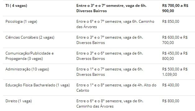 O valor das bolsas variam entre R$ 400 e R$ 1.039. Para participar, os interessados devem se inscrever no site, efetuar o login e escolher a vaga.