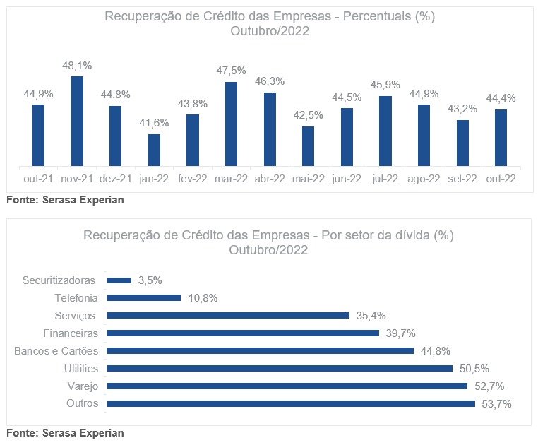 Dados divulgados pelo Indicador de Recuperação de Crédito da Serasa Experian nesta segunda-feira (06) apontam que, em outubro do ano passado, as empresas brasileiras regularizaram 44,4% das dívidas inadimplentes em até 60 dias de negativação.