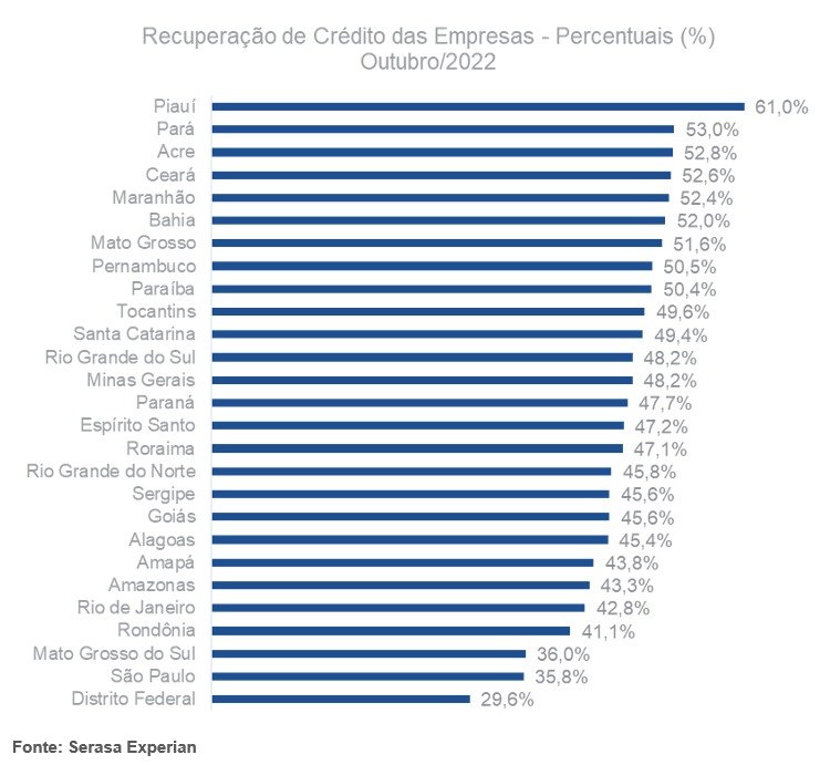 A análise por regiões revelou que a região Nordeste do Brasil alcançou o maior percentual de recuperação de dívidas inadimplentes em outubro, marcando 51,3%. A região Sul também teve destaque, ficando em segundo lugar com 48,3% dos débitos ressarcidos. Em ordem decrescente estavam: Norte (47,9%), Centro-Oeste (42,1%) e Sudeste (39,9%).