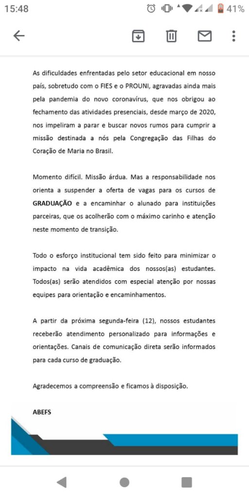 Assim, como outras pessoas, Amanda* fala que soube do fechamento somente pela internet. "Fiquei sabendo por meio de colegas que enviaram uma nota da instituição comunicando a suspensão das atividades no grupo do Whatsapp. Estou chocada e estou muito triste também. Sinceramente, achei uma sacanagem tanto com os alunos quanto com os docentes. Todos ficaram sabendo da pior forma.. pela internet (...) pelo menos eu não recebi nenhuma ligação ou chamamento. A instituição só disse que iria entrar em contato para falar sobre as transferências." Confira o comunicado enviado no grupo dos alunos.
