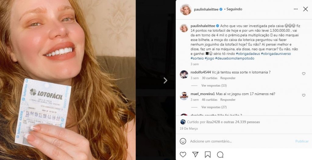 Pasmem! Após ganhar 48 vezes na loteria, a ex-BBB Paulinha Leitte posou rindo à toa com os recibos em mãos neste fim de semana. A sortuda, que foi clicada em um hotel que fica na zona sul de São Paulo, afirmou que até hoje já embolsou mais do que o prêmio total do Big Brother Brasil. Na última vez que acertou na loteria, ela ganhou mais de R$ 4 mil e ainda disse que por pouco não embolsaria R$ 1,5 milhão. "Acho que vou ser investigada pela caixa. Fiz 14 pontos na lotofacil de hoje, e por um não levei 1.500.000.00. Vai dar em torno de R$ 4 mil o prêmio, pela multiplicação. Eu não marquei esse bilhete, a moça do caixa da lotérica perguntou: 'Vai fazer nenhum joguinho da lotofacil hoje?' Eu não? Aí pensei melhor e disse, faz um aí na máquina, e ela disse: 'Não quer marcar?' Eu não, não e ganhei. Sério, tô rindo", disse em meados de março. Na ocasião, ela ainda acertou a quina e duas quadras da Mega Sena em três jogos feitos de uma só vez.
