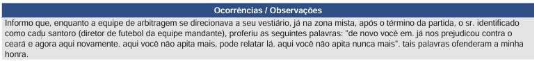 De acordo com o documento oficial, o dirigente abordou a equipe de arbitragem e fez duras críticas ao juiz da partida. "De novo você, em. Já nos prejudicou contra o Ceará e agora aqui novamente. Aqui você não apita mais, pode relatar lá. Aqui você não apita nunca mais", disse.