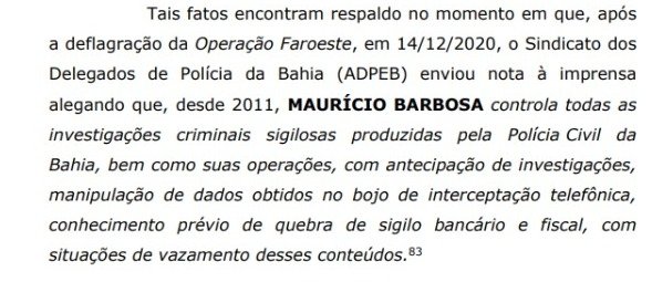 Segundo a acusação, Maurício Barbosa tinha controle sobre “todas as investigações criminais sigilosas produzidas pela Polícia Civil da Bahia, bem como suas operações, com antecipação de investigações, manipulação de dados obtida no bojo de interceptação telefônica, conhecimento prévio de quebra de sigilo bancário e fiscal, com hipóteses de vazamento conteúdo teoricamente".