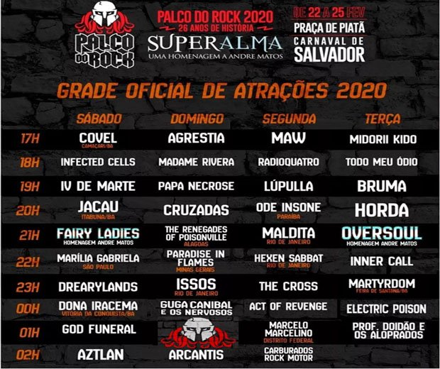 Neste ano, o Palco do Rock terá como homenageado o cantor e compositor André Matos, vocalista de clássicas bandas do heavy metal brasileiro, como 'Viper', 'Angra' e 'Shaman'. Confira abaixo a programação completa:
