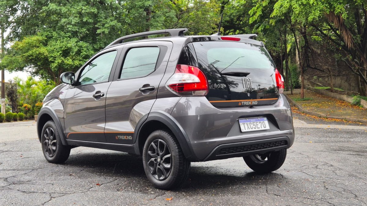 A versão Trekking mantém visual específico, com faróis halógenos, aplique frontal com identificação Trekking e acabamento escurecido na grade. A tampa traseira de vidro permanece como elemento de design, mas tem custo elevado em caso de danos. Sem o pacote de tecnologia, as rodas são de aço aro 14 com calotas de liga leve escurecida como opcional.