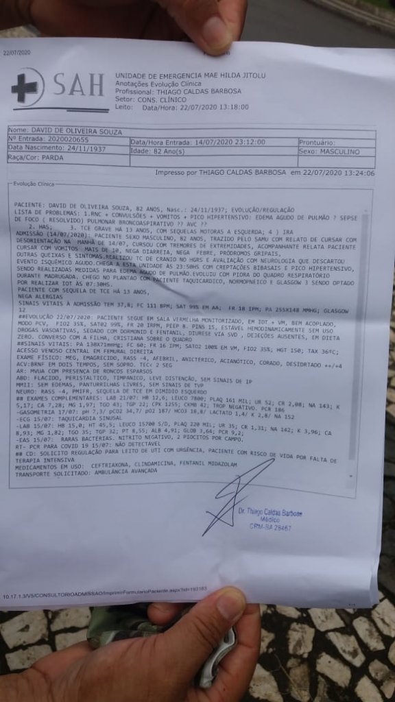 Há 14 dias, Cristiana da Silva Oliveira Souza tenta transferir seu pai idoso para um hospital que atenda seu caso. Internado na Unidade de Emergência Mãe Hilda Jitolu, no Curuzu, David de Oliveira Souza, de 83 anos, chegou na unidade com picos hipertensivos com crises de convulsões e precisou ser intubado e hoje, segundo a denúncia da filha, encontra-se exposto a outros pacientes com Covid-19.