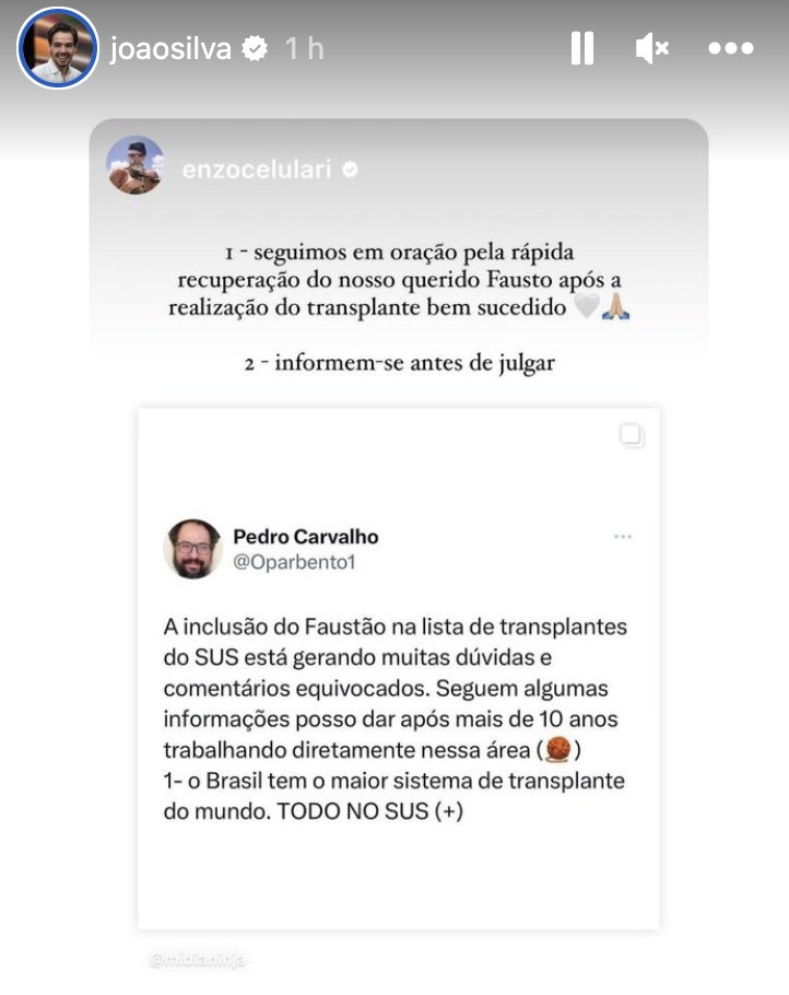 João Guilherme Silva compartilhou uma publicação de Enzo Celulari em defesa do transplante pai, Fausto Silva, que foi realizado neste domingo, 27. É que muitos estão questionando a rapidez do processo. Na publicação, o filho de Claudia Raia pede que não sejam realizados pré-julgamentos sobre o procedimento. "Seguimos em oração pela rápida recuperação do nosso querido Fausto após a realização do transplante bem sucedido. Informem-se antes de julgar". Além de ter sido compartilhado por Enzo, o post que João Guilherme endossou foi publicado pelo Mídia Ninja e mostra que há muitas variáveis na hora de se decidir quem vai receber um órgão. "Por fim, um exercício de empatia após ver muito gente dizer: "não quero doar, pois pode haver muita coisa errada no sistema". Ponha-se no lugar do outro: se fosse você, precisando de um órgão para ficar vivo, tenho certeza absoluta que esperaria muito o "sim" de alguém à doação."