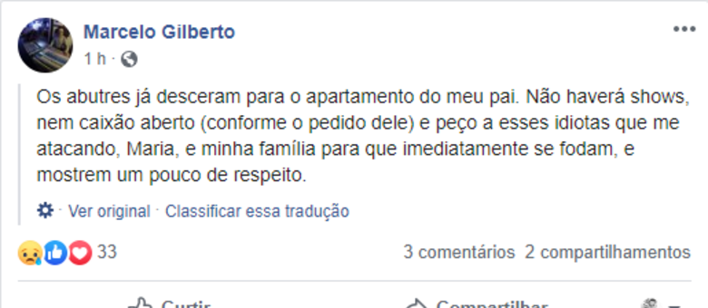 "Os abutres já desceram para o apartamento do meu pai. Não haverá shows, nem caixão aberto (conforme o pedido dele)", escreveu Marcelo no Facebook