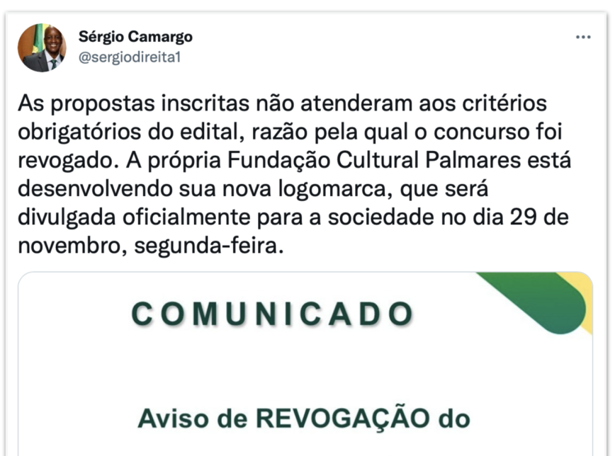 A Fundação Cultural Palmares cancelou, nesta segunda-feira (22), o edital do concurso que escolheria o novo logotipo da instituição. De acordo com o presidente, Sérgio Camargo, as inscrições "não atenderam aos critério obrigatórios".