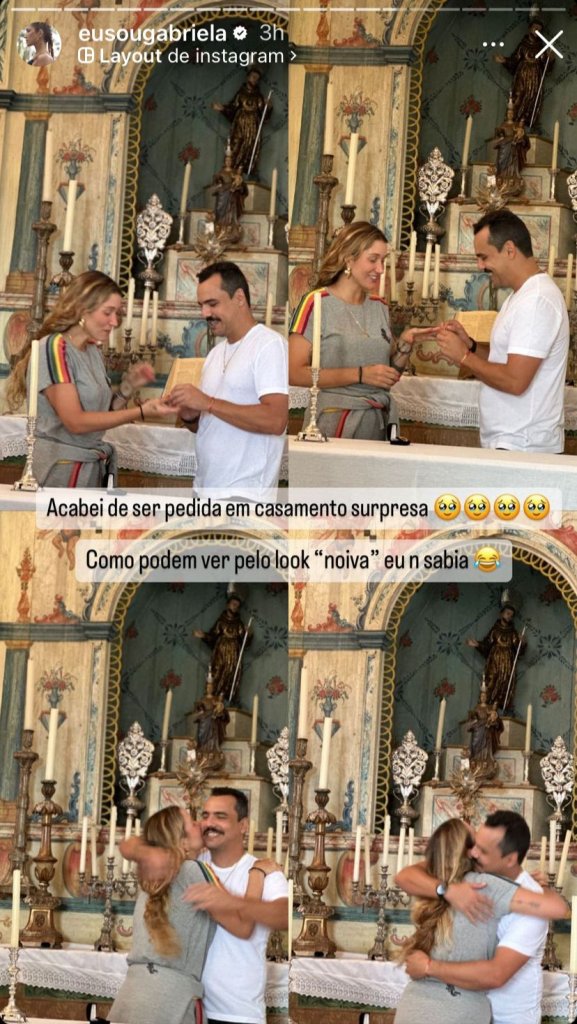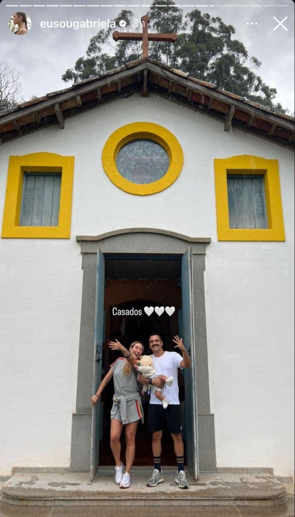 Gabriela e Túlio posaram na porta da igreja, com o filho Lion, de cinco meses, no colo, enquanto exibiam as novas alianças: “Casados”, Pugliesi declarou. Ela ainda revelou alguns dos convidados da reunião íntima e surgiu ao lado da atriz Fiorella Mattheis (35), que cobre a cabeça de seu recém nascido com a mão no registro.