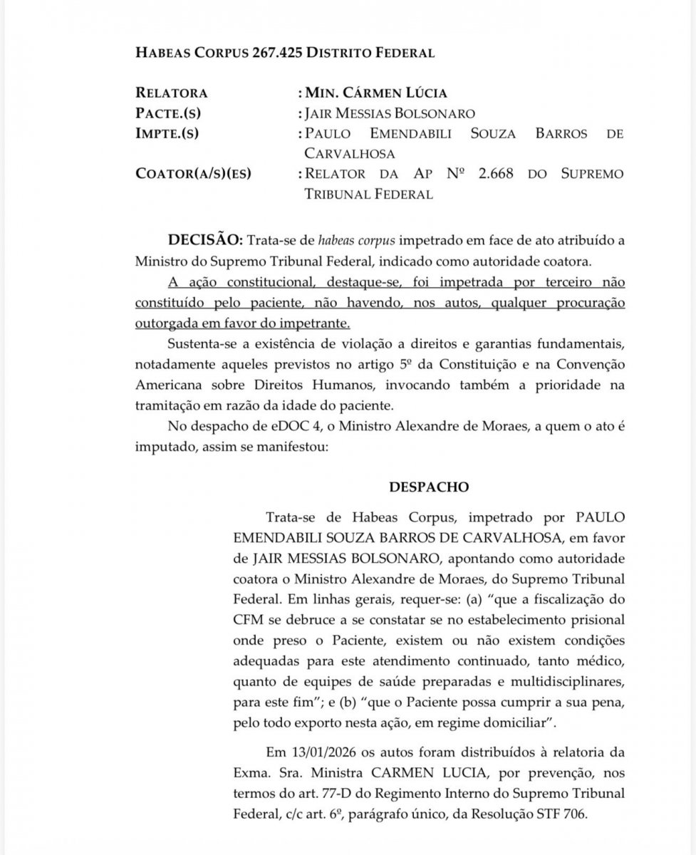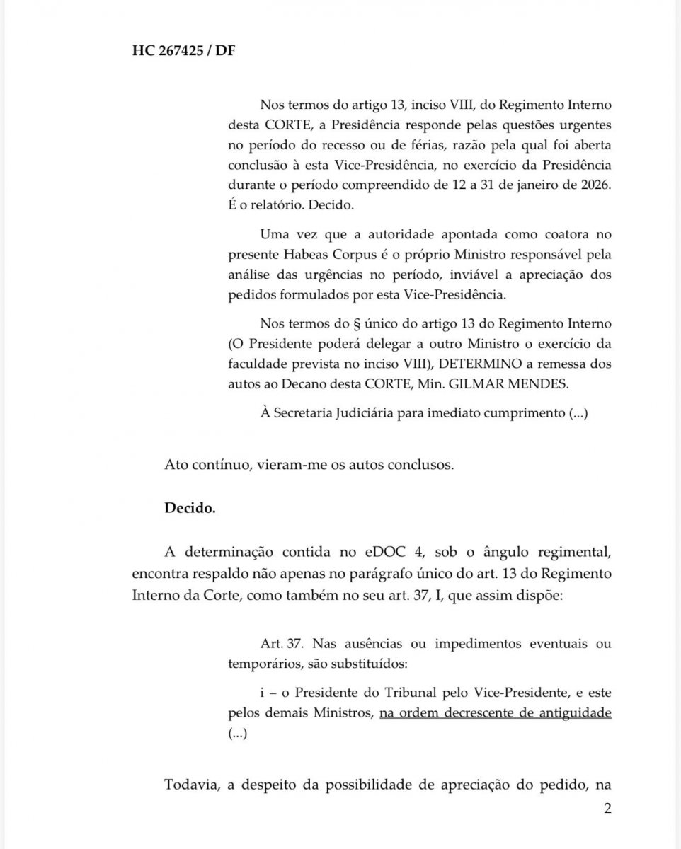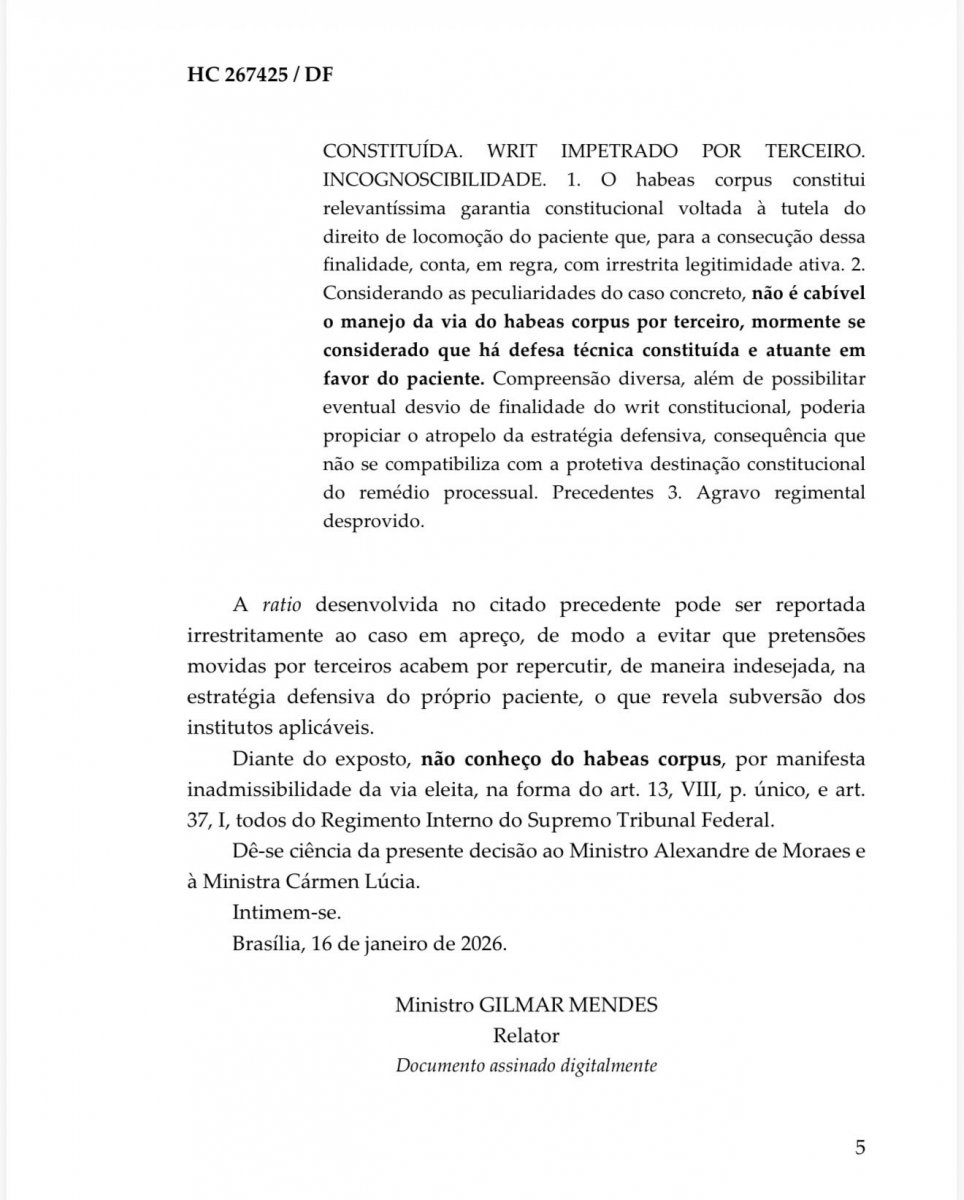 Na sexta-feira (16), Moraes encaminhou o processo para Gilmar Mendes após reconhecer impedimento para analisá-lo. Por ser autoridade apontada no habeas corpus, ele declarou impedimento para julgar a questão.