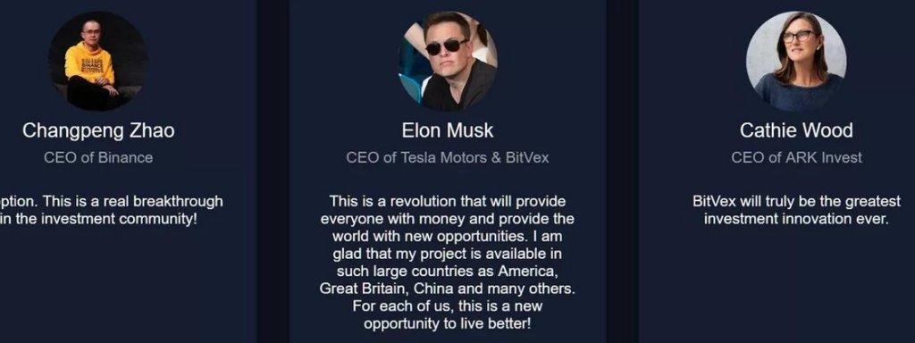 No site, a BitVex afirma que Elon Musk é CEO, enquanto o fundador da Binance, Changpeng Zhao, e Cathie Wood da Ark Invest são apoiadores do projeto. Aparentemente, foram roubados apenas US$ 1700 até o momento com o elaborado esquema.