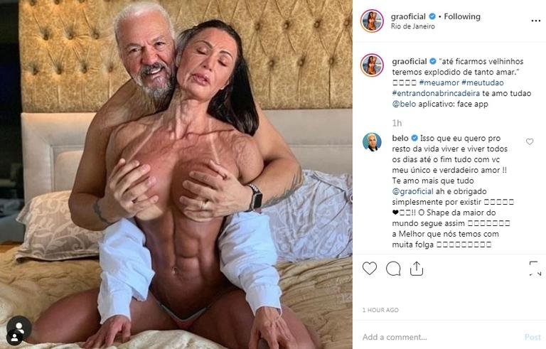 Ontem, Gracyanne Barbosa mostrou como ela e o esposo Belo ficarão mais velhos. Na legenda, a musa fitness aproveitou para escrever uma declaração para o cantor. "Até ficarmos velhinhos teremos explodido de tanto amar", escreveu ela que logo foi correspondida por Belo.
