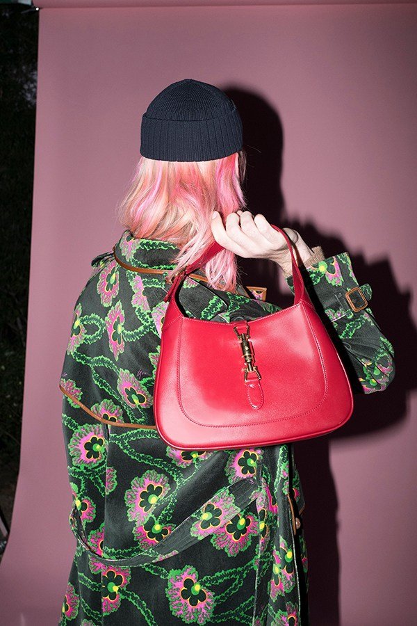 O batom da Gucci Beauty ganhou uma nova versão no vermelho “Goldie Red”, assim como a bolsa ‘Jackie’, que chega em couro vermelho e rosa.