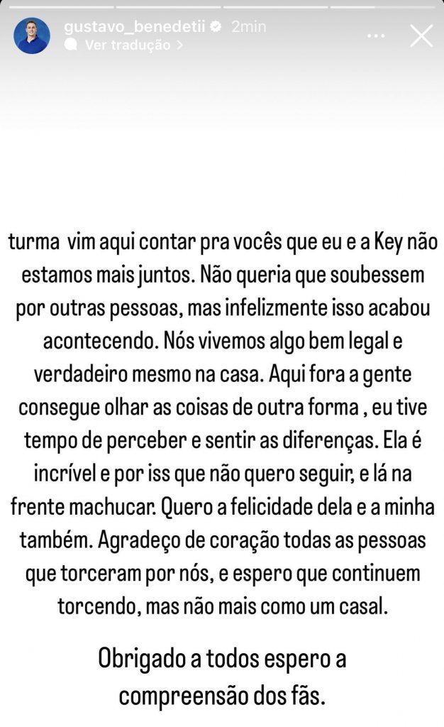 Fim do namoro! Gustavo Benedeti acaba de anunciar que chegou ao fim seu relacionamento com Key Alves. Nas redes sociais, ele revelou de quem partiu a decisão e qual o motivo. Já a atleta apareceu aos prantos na web. Os dois estavam juntos desde o início do #BBB23.