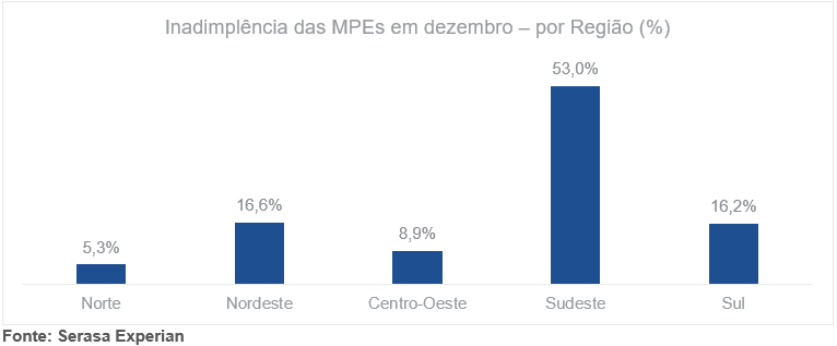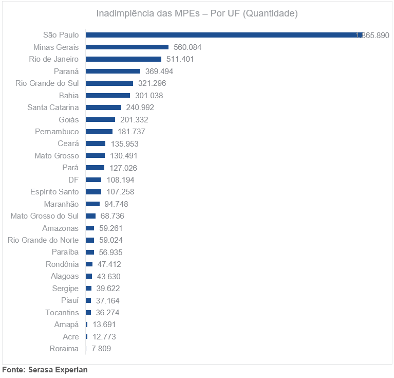 Ainda de acordo com os dados, a maior parte das MPEs com CNPJs negativados eram do Sudeste (53%) e a menor parcela do Norte (5,3%). Com São Paulo (1.865.890), Minas Gerais (560.084) e Rio de Janeiro (511.401), o Sudeste liderou o ranking das Unidades Federativas (UFs) com mais micro e pequenas empresas inadimplentes. Confira classificações por região e estado nos rankings abaixo: