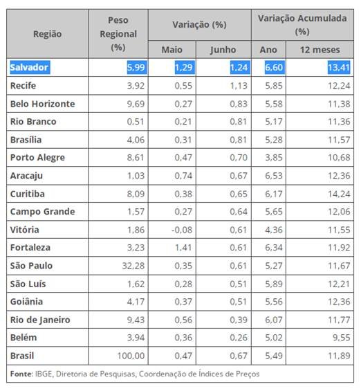 No geral, todos os 16 locais pesquisados para calcular a inflação oficial do Brasil tiveram altas no IPCA. Em junho, os menores índices foram os das RM Belém/PA (0,26%) e Rio de Janeiro/RJ (0,39%) e do município de Goiânia/GO (0,51%). Com o resultado, o IPCA na RM Salvador acumula alta de 6,60% no primeiro semestre de 2022. Está acima do índice nacional (5,49%) e também é o maior do país.