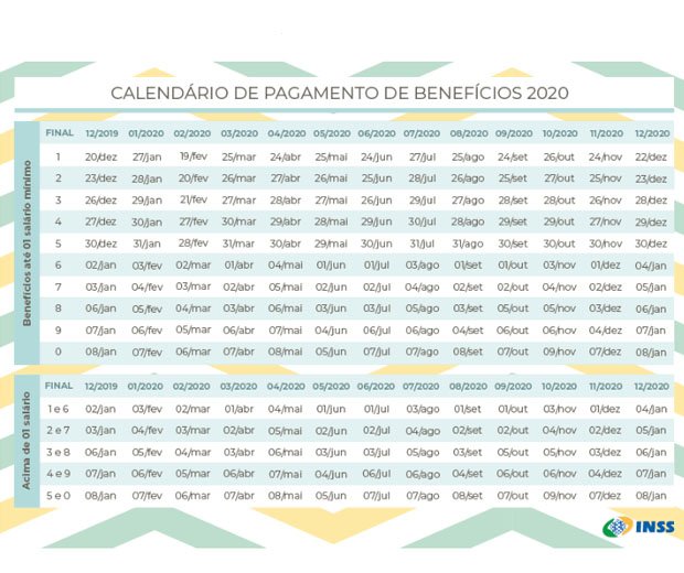 O Instituto Nacional do Seguro Social (INSS) divulgou na última segunda-feira (16) o calendário de pagamentos dos aposentados e pensionistas para o ano de 2020. Os depósitos seguirão como nos anos anteriores.