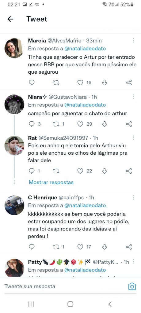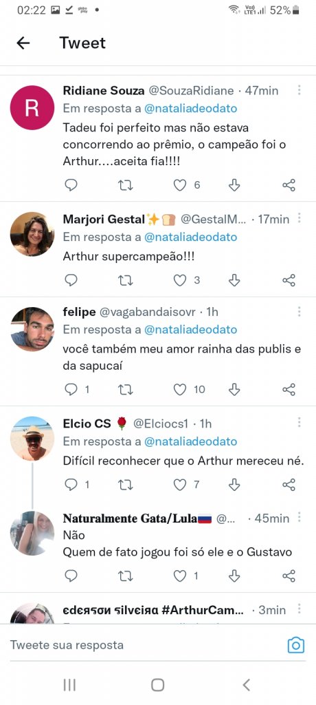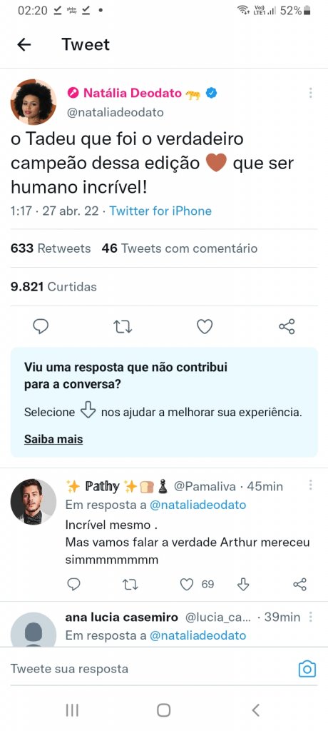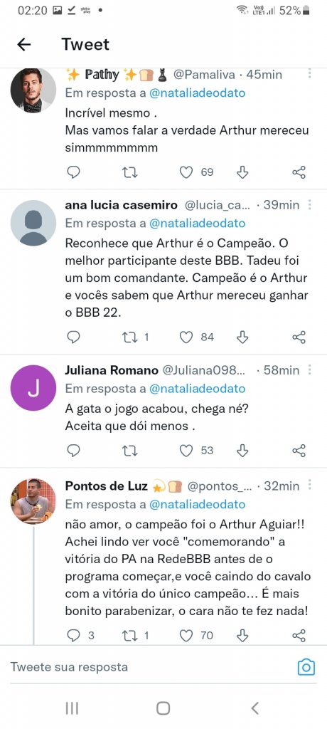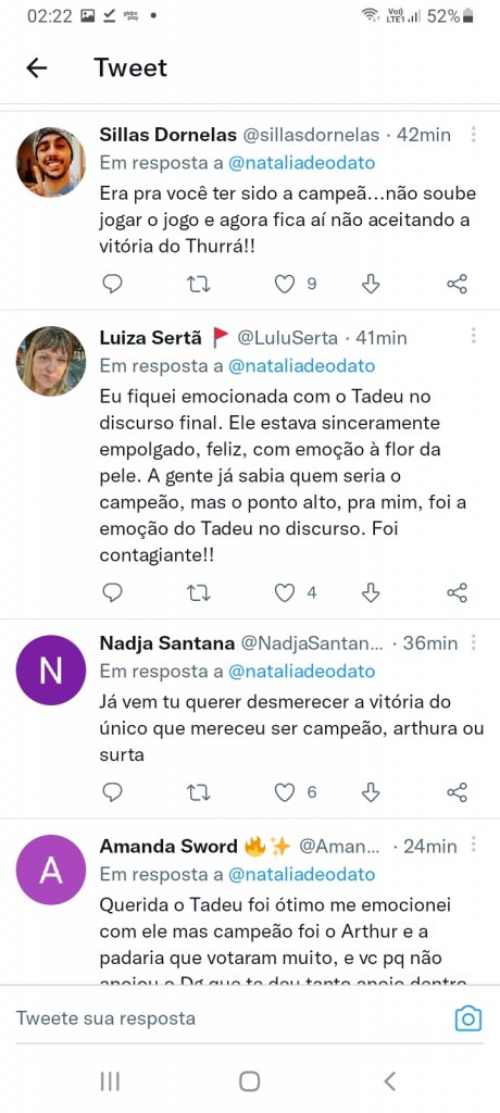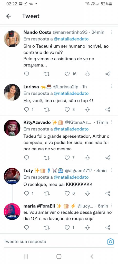 Natália Deodato continua causando mesmo estando fora da casa mais vigiada do Brasil. Assim que foi anunciada a vitória de Arthur Aguiar, ela postou no Twitter que o campeão do BBB 22 foi Tadeu Schmidt. Rapidamente, os fãs do pãozinho soltaram o verbo em cima Natália. Confira abaixo a repercussão: