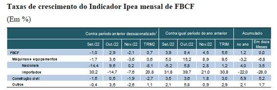 Em relação ao mesmo período de 2021, o Indicador Ipea apontou alta de 4,5% nos investimentos totais em novembro e 5,6% no trimestre móvel. No acumulado em 12 meses até novembro, o crescimento foi nulo, conforme tabela abaixo, que apresenta a evolução da FBCF e de seus componentes: