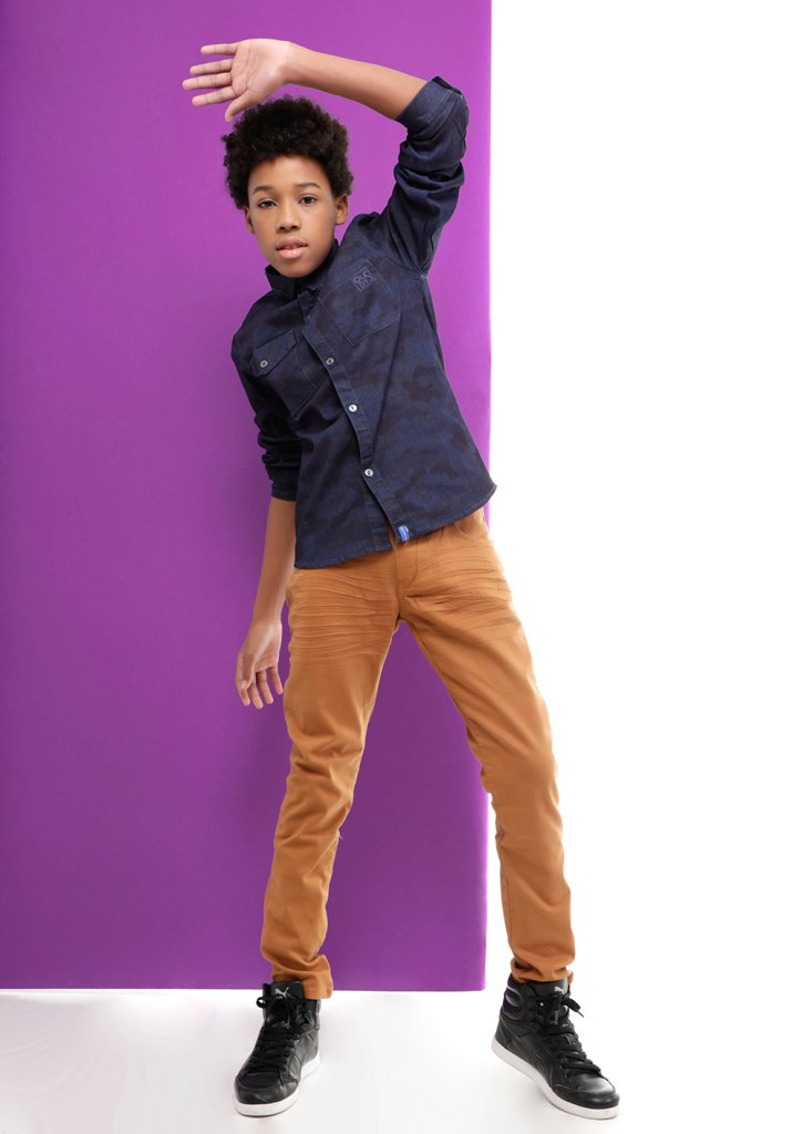 Modelo Marcos Henrique Silva veste camisa jeans com estampa camuflada e calça jeans caramelo: Dudys Jeans; Tênis: acervo.