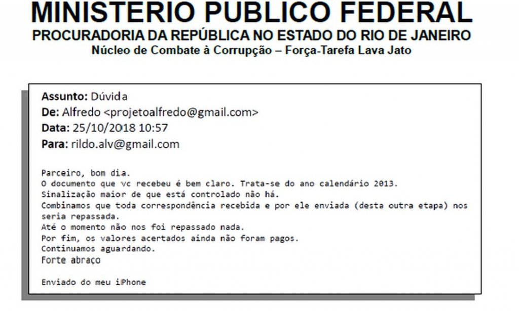 A força-tarefa da Lava-Jato provou que o e-mail "projetoalfredo@gmail" era usado pelo analista tributário da Receita Federal, Marcial Pereira de Souza para cobrar propina de empresários em troca do cancelamento de multas milionárias por sonegação fiscal.