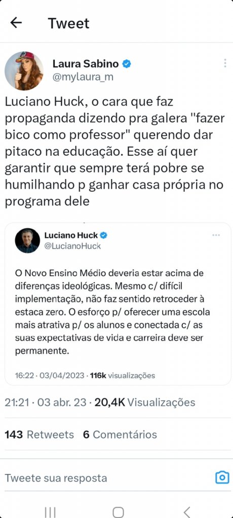 Luciano Huck agitou a web ao reagir nas redes sociais à notícia de que o Ministério da Educação irá suspender a implementação do Novo Ensino Médio (NEM). O apresentador da TV Globo não gostou da decisão e criticou dizendo que isso equivale a retornar do início. "O Novo Ensino Médio deveria estar acima de diferenças ideológicas. Mesmo com difícil implementação, não faz sentido retroceder à estaca zero", começou o anfitrião do Domingão em seu Twitter nesta segunda-feira (03). Em seguida, o marido de Angélica completou: "O esforço para oferecer uma escola mais atrativa para os alunos e conectada com as suas expectativas de vida e carreira deve ser permanente". Entretanto, ele não agradou internautas com sua declaração. "Coloca seus filhos pra estudar em alguma escola pública estadual de periferia então", detonou um rapaz. "Luciano, acho que você deveria ir cuidar do novo Domingão, que está com difícil implementação e você não conseguiu tornar mais atrativo para os espectadores. Deixe o Ensino Médio para quem sobre o tema", opinou outro.