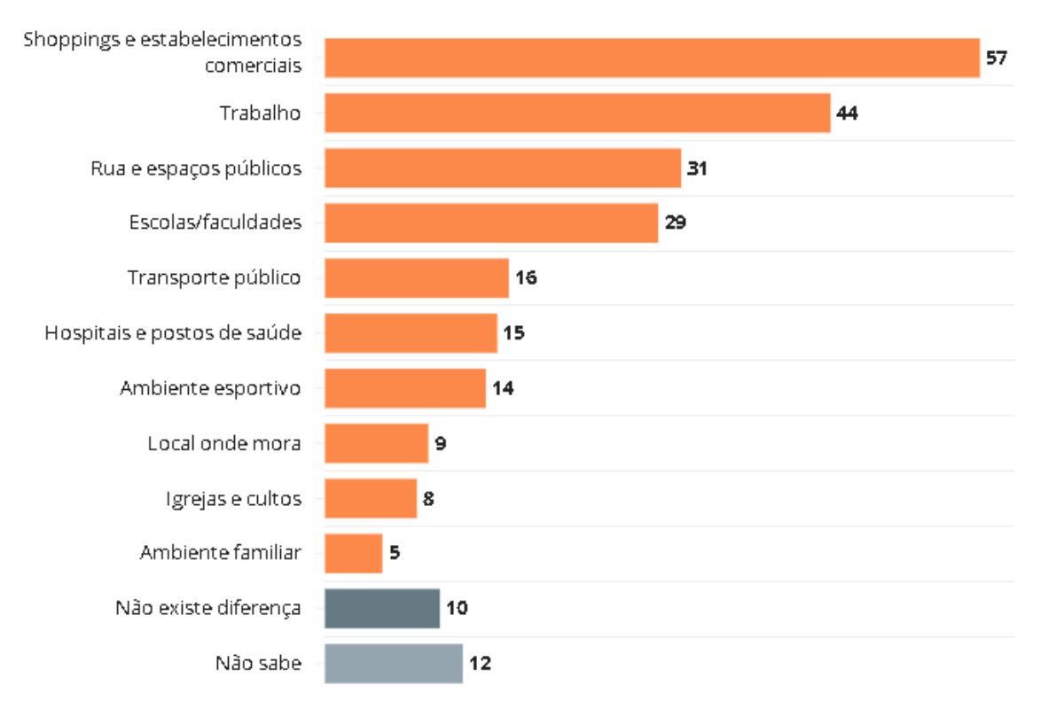 Depois dos estabelecimentos comerciais, os lugares mais citados foram o trabalho, com 44%, incluindo processos de seleção, dia a dia e promoção profissional; e as ruas e os espaços públicos de convivência, com 31%, como parques e praças.