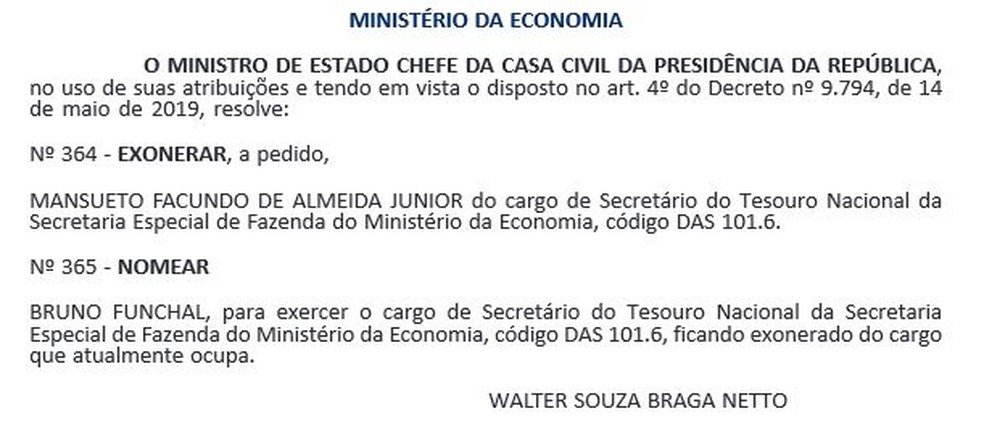 De acordo com informações do ministério da Economia, Funchal assume de maneira definitiva a partir do dia 31 de julho. Até chegar a data, haverá um processo de transição entre o atual e o futuro secretários.