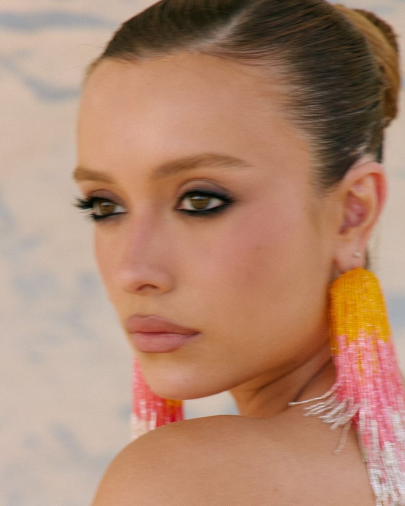A maquiagem, com aplicação de plumas na mesma paleta do vestido, surge como extensão artística do look em referência à natureza exuberante e ao movimento da carnavália, reinterpretados de maneira contemporânea.