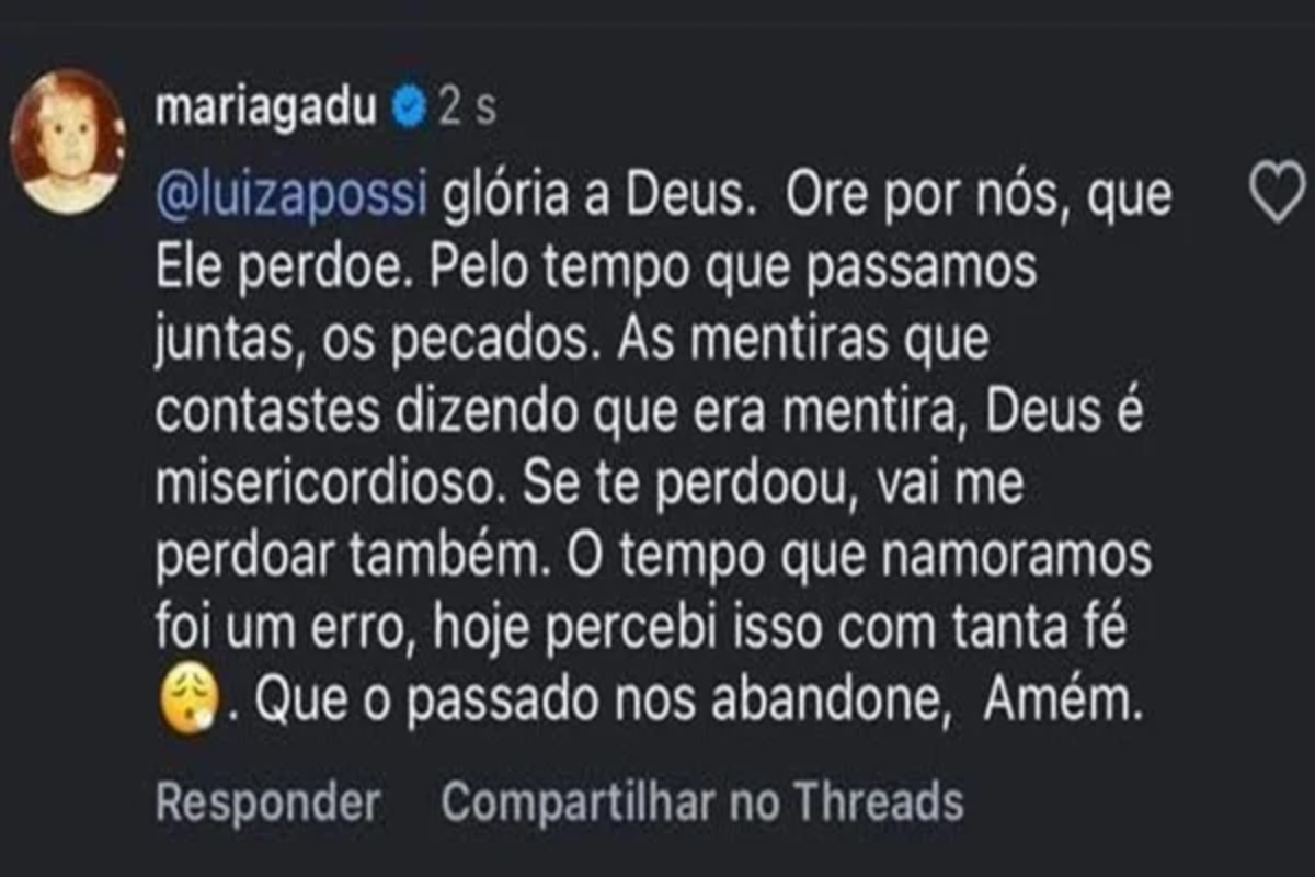 "Luiza Possi, glória a Deus. Ore por nós, que Ele perdoe. Pelo tempo que passamos juntas, os pecados. As mentiras que contastes dizendo que era mentira, Deus é misericordioso. Se te perdoou, vai me perdoar também. O tempo que namoramos foi um erro, hoje percebi isso com tanta fé. Que o passado nos abandone, amém", publicou.