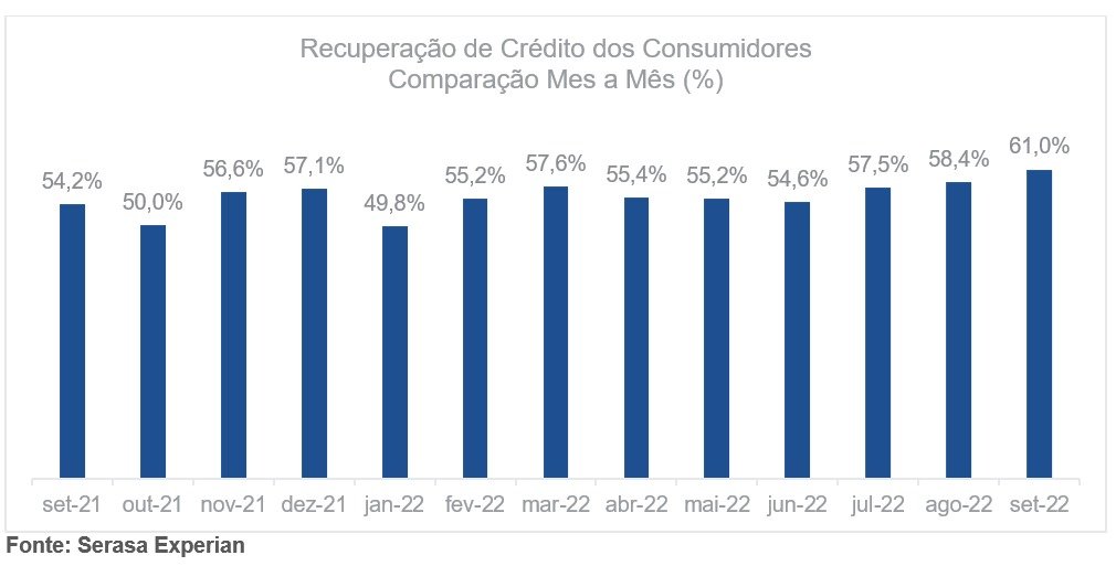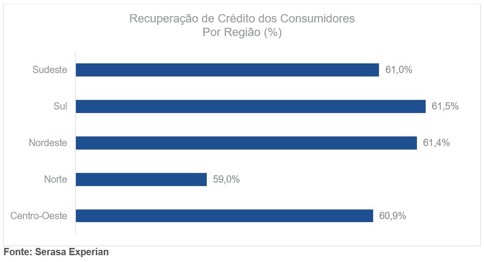 Dados do Indicador de Recuperação de Crédito da Serasa Experian mostram que, em setembro, a média nacional de contas atrasadas quitadas pelos consumidores, em até 60 dias após a negativação, foi de 61%. Segundo o levantamento, cerca de 73,2% das dívidas com até 30 dias de vencimento foram pagas no mês. O Nordeste do país apresentou a segunda maior taxa de pagamento de débitos inadimplentes (61,4%).