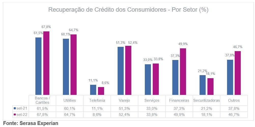 Na análise por valor, foram os encargos atrasados de mais de R$10 mil que conseguiram a melhor taxa de pagamento (69%) e aqueles com até R$ 500 vieram na sequência (63,1%). Os débitos entre R$ 500 e R$ 1 mil completam o ranking (57,2%) junto da faixa de R$ 2 a R$ 10 mil (55,5%) e R$1 mil a R$ 2 mil (54,4%). O levantamento mostra ainda que foi o setor de Banco e Cartões que liderou com a maior taxa de pagamentos no período (67,8%), seguido pelo de Utilities, que considera contas básicas como energia, gás e água (64,7%).