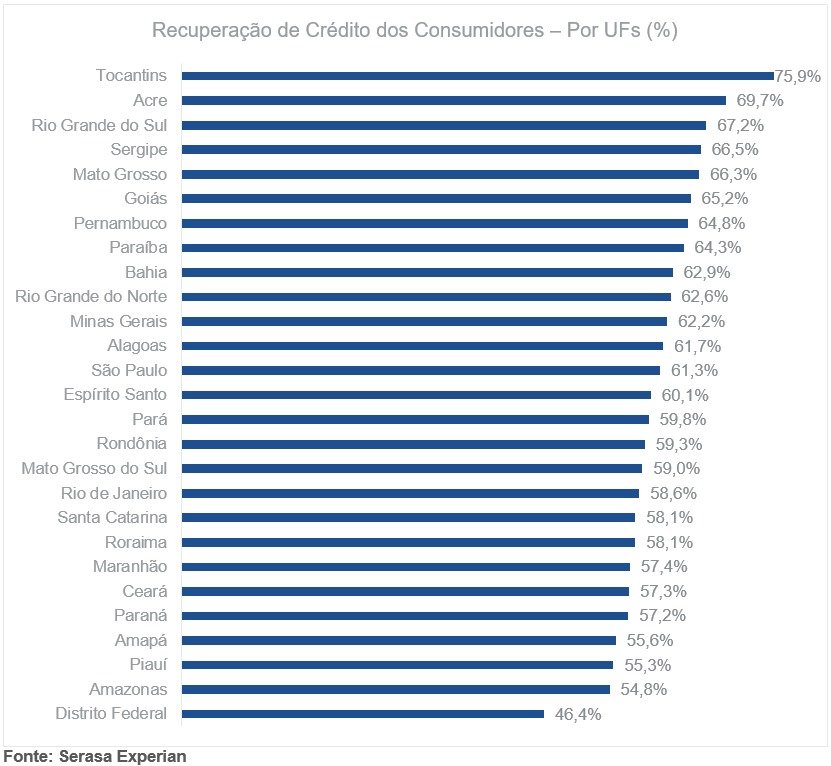 Considerando a análise nacional por meio do recorte por Unidades Federativas (UFs), o estado do Tocantins apresentou a parcela mais expressiva de quitações de contas em atraso pelos consumidores, com 75,9% recuperadas em até 60 dias a partir de setembro. Na sequência, temos o Acre (69,7%), o Rio Grande do Sul (67,2%) e Sergipe (66,5%). No gráfico a seguir estão os dados completos, veja: