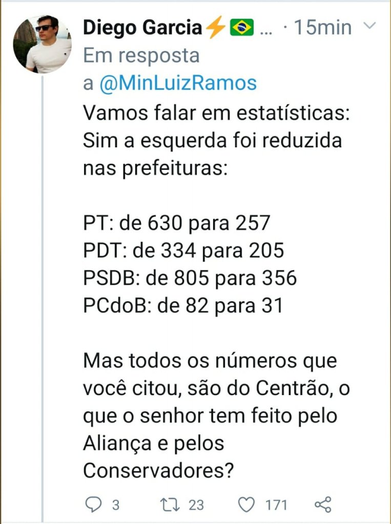 O Ministro da Secretária Geral de Governo, Gen Luiz Ramos, postou nesta segunda (16), em seu Twitter que "a esquerda saiu derrotada nas eleições". Publicando números que mostraram as prefeituras perdidas pelo PT, o Ministro fez conta de que partidos como o DEM, MDB e PP ganharam musculatura e conseguiram emplacar novos prefeitos, fazendo com que a maioria dos municípios de grande porte passem a ser governados por "pseudo apoiadores" do presidente Jair Bolsonaro.