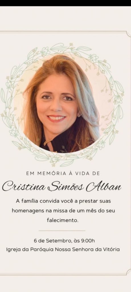 Está marcada para o dia 6 de setembro, às 9 horas da manhã, na Igreja Nossa Senhora da Vitória, a missa de um mês, do falecimento da querida galerista Cristina Alban.