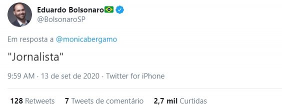 Quem também respondeu a postagem feita pela jornalista foi o deputado federal Eduardo Bolsonaro (PSL-SP). O parlamentar utilizou ironia ao se referir a Bergamo. Confira: