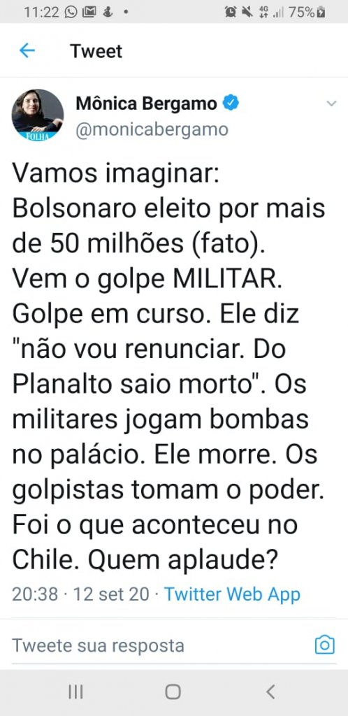 Mônica Bergamo da Folha de São Paulo sugere golpe contra Bolsonaro