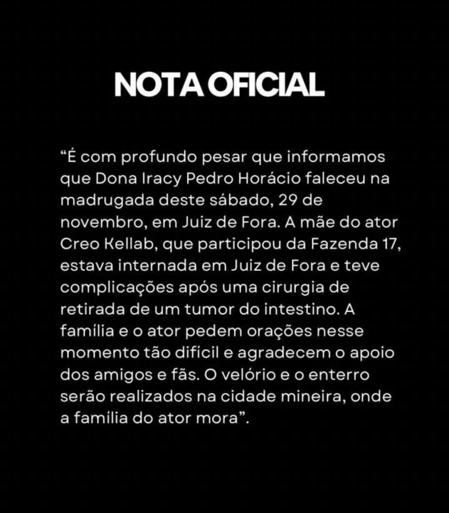 Que tristeza! O ex-peão Creo Kellab está de luto! Isso porque a mãe dele, Dona Iracy Pedro Horácio, morreu na madrugada deste sábado, 29, após ter um problema de saúde. Ela foi diagnosticada com um tumor no intestino, passou por cirurgia e ficou em coma, mas não resistiu e veio à óbito. A morte dela foi anunciada na manhã deste sábado, 29, por meio de um comunicado escrito pela equipe do artista.