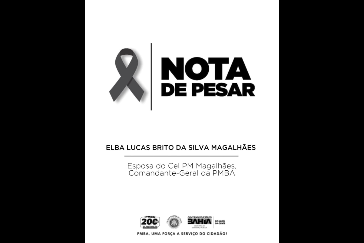 A Polícia Militar da Bahia (PM-BA) publicou nota oficial nas redes sociais, na noite de domingo (21), para comunicar a morte de Elba Lucas Brito da Silva Magalhães, esposa do coronel Antonio Carlos Silva Magalhães, comandante-geral da corporação.