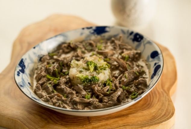 Filé com shimeji, refogados no creme de leite. Acompanha porção de arroz com brócolis.