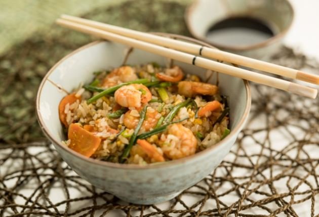 Delicioso Gohan chapeado com recheio de camarão, ovos mexidos, cebola caramelizada, nirá e cenoura. A receita é finalizada com molho de ostras.