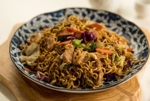 Macarrão para yakisoba chapeado e misturado com a proteína da preferência do cliente, legumes (repolho, brócolis, acelga, couve-flor, cenoura) e molho de yakisoba. O prato conta com quatro opções de sabores: frango, carne, misto e camarão.