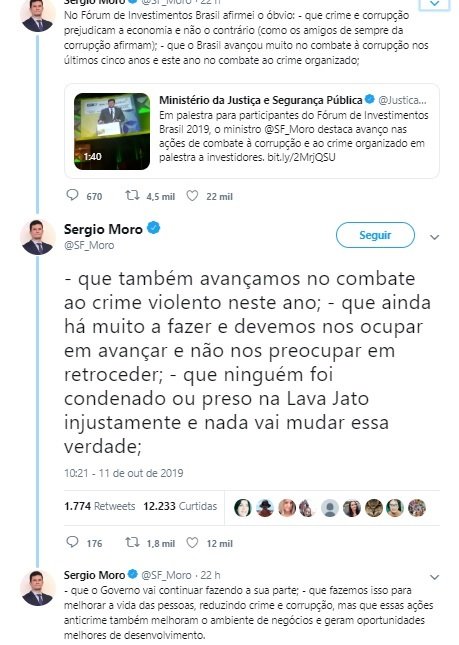 Nas redes sociais, o ministro da Justiça e Segurança Pública, Sérgio Moro, fez publicações sobre a sua participação no segundo dia do Fórum de Investimentos, realizado nesta sexta-feira (11), em São Paulo.