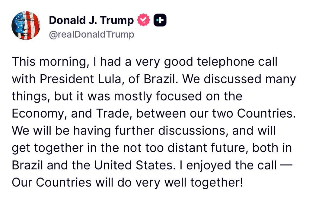 "Nesta manhã, eu fiz uma chamada telefônica muita boa com o presidente Lula, do Brasil. Nós discutimos muitas coisas, mas a conversa focou principalmente na economia e no comércio entre os dois países", declarou o norte-americano. "Nós teremos futuras discussões e nos reuniremos em um futuro não muito distante, tanto no Brasil quanto nos Estados Unidos. Eu gostei da ligação — nossos países irão muito bem juntos!", escreveu no post.