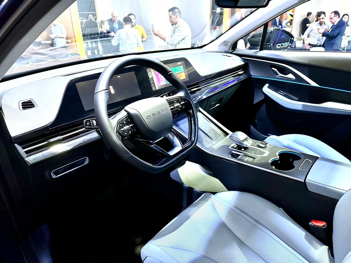 O Omoda 5 EV é a versão elétrica do SUV médio que também será vendida por aqui. O visual parecido no entanto revela que o modelo elétrico é mais refinado. No painel há superfície sensível ao toque, telas digitais e amplo console central.