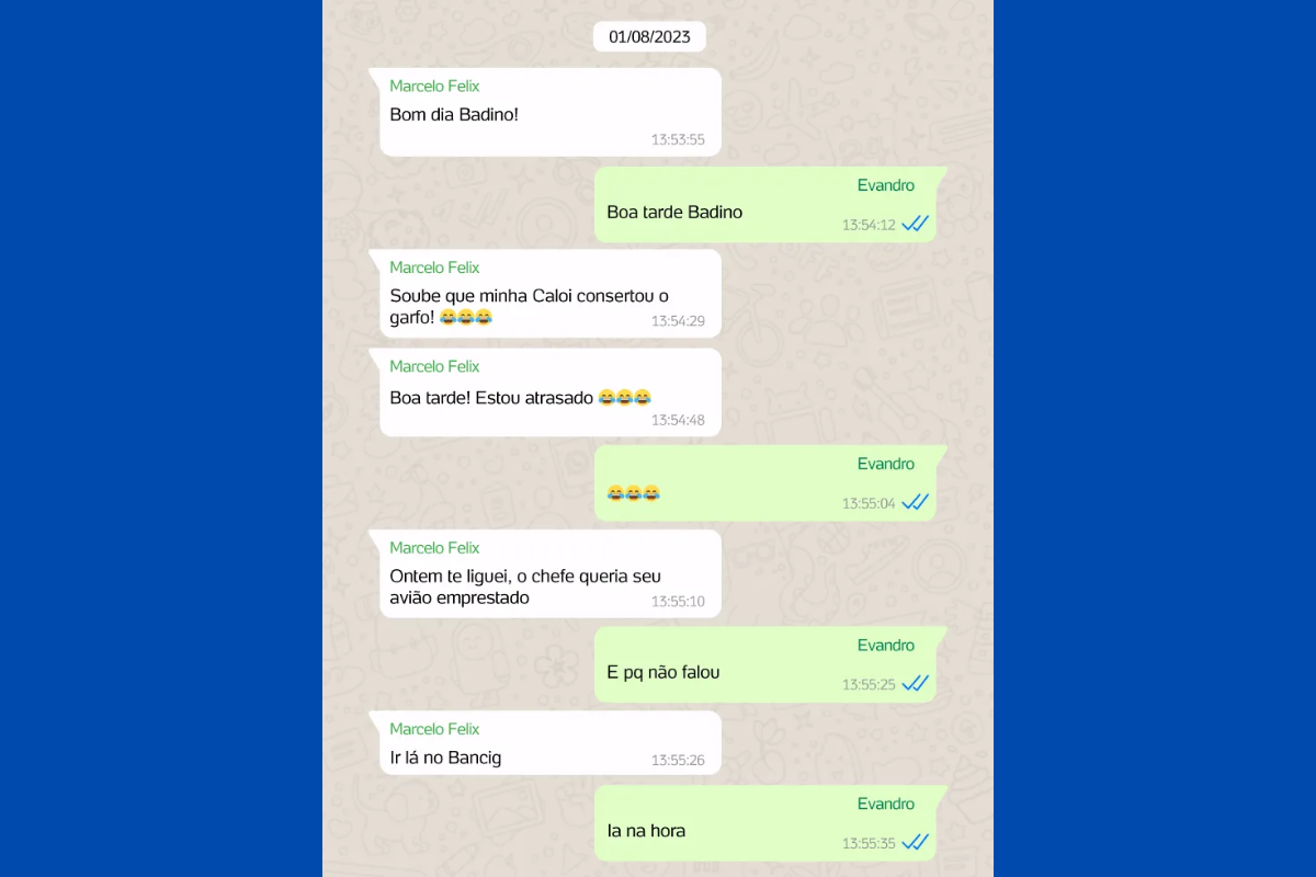 Em outro trecho da conversa entre os homens, Marcelo diz que "o chefe" queria o avião emprestado. Félix, inclusive era um dos deputados que usavam regularmente o avião de Alex Parente, outro integrante do grupo de Evandro, que já protagonizou outro episódio na Overclean.