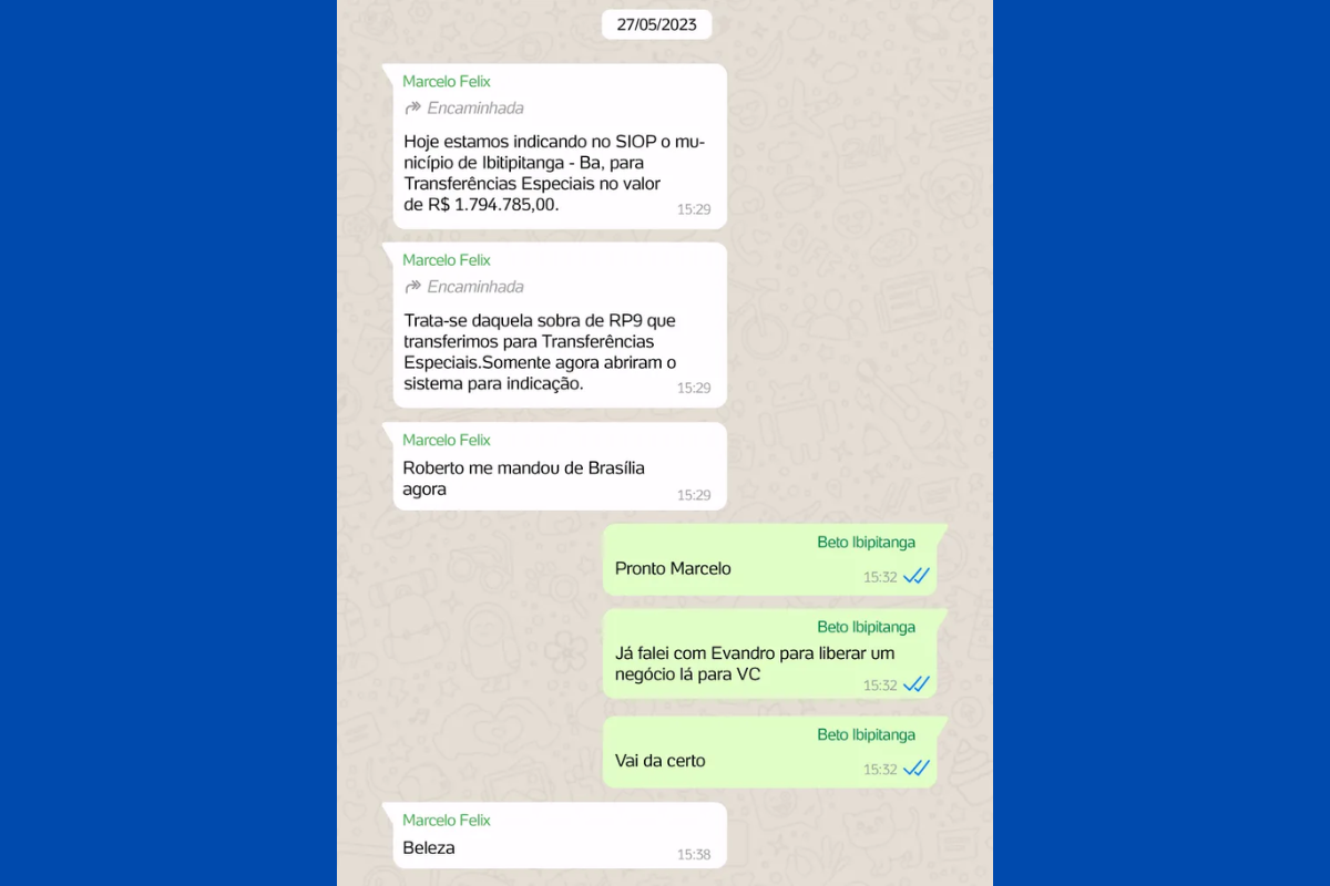 Em Ibipitanga, segundo a PF, Marcelo cobrou até que a empresa de Evandro fosse contratada pela prefeitura e, depois de Félix enviar emendas, em meados de 2023, pressionou novamente pela suposta propina.