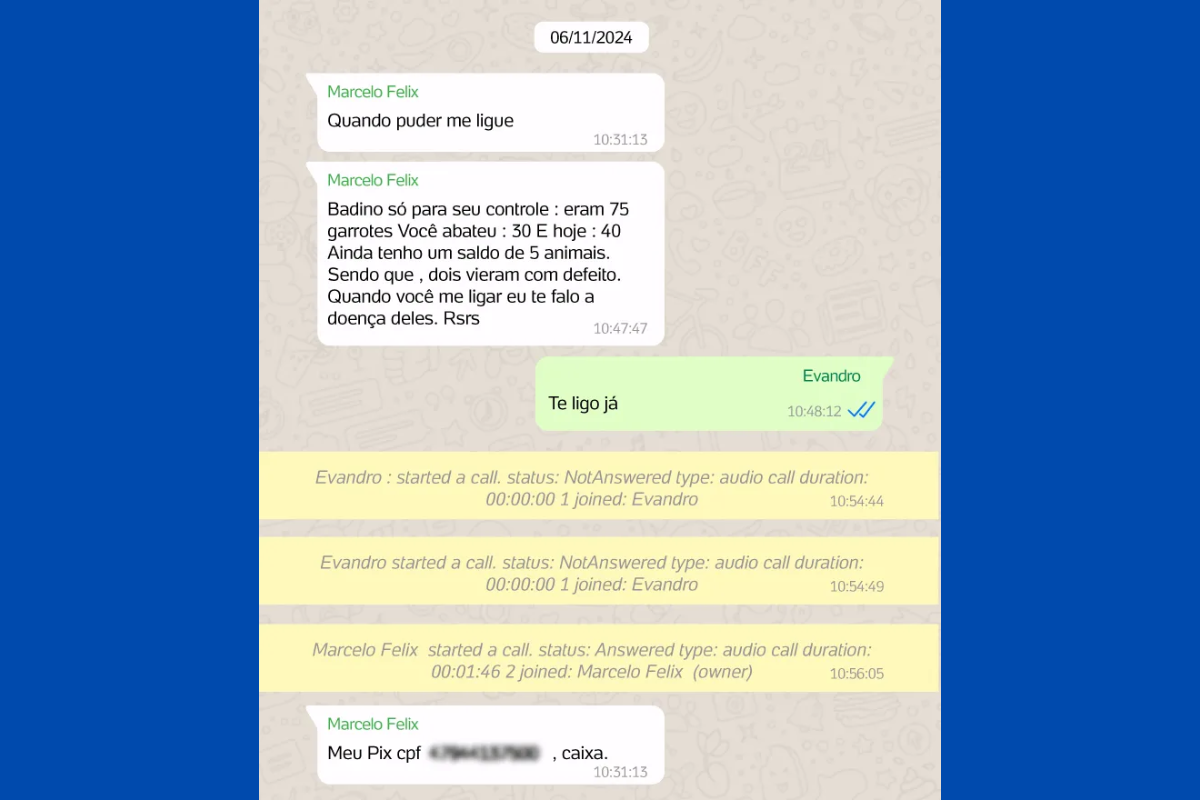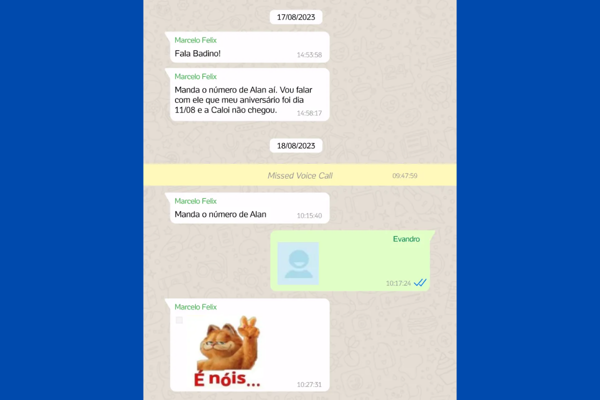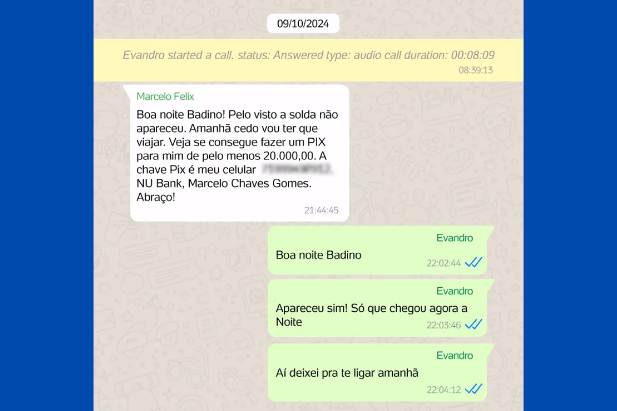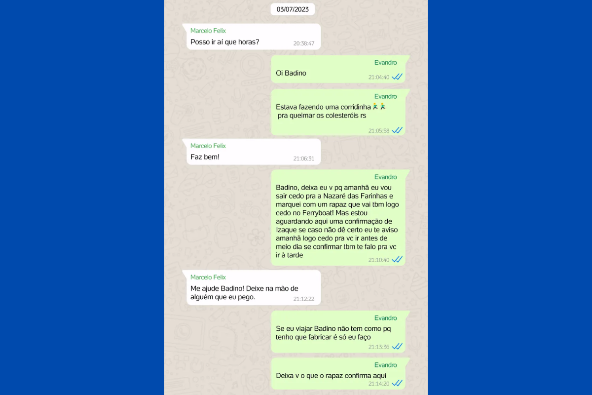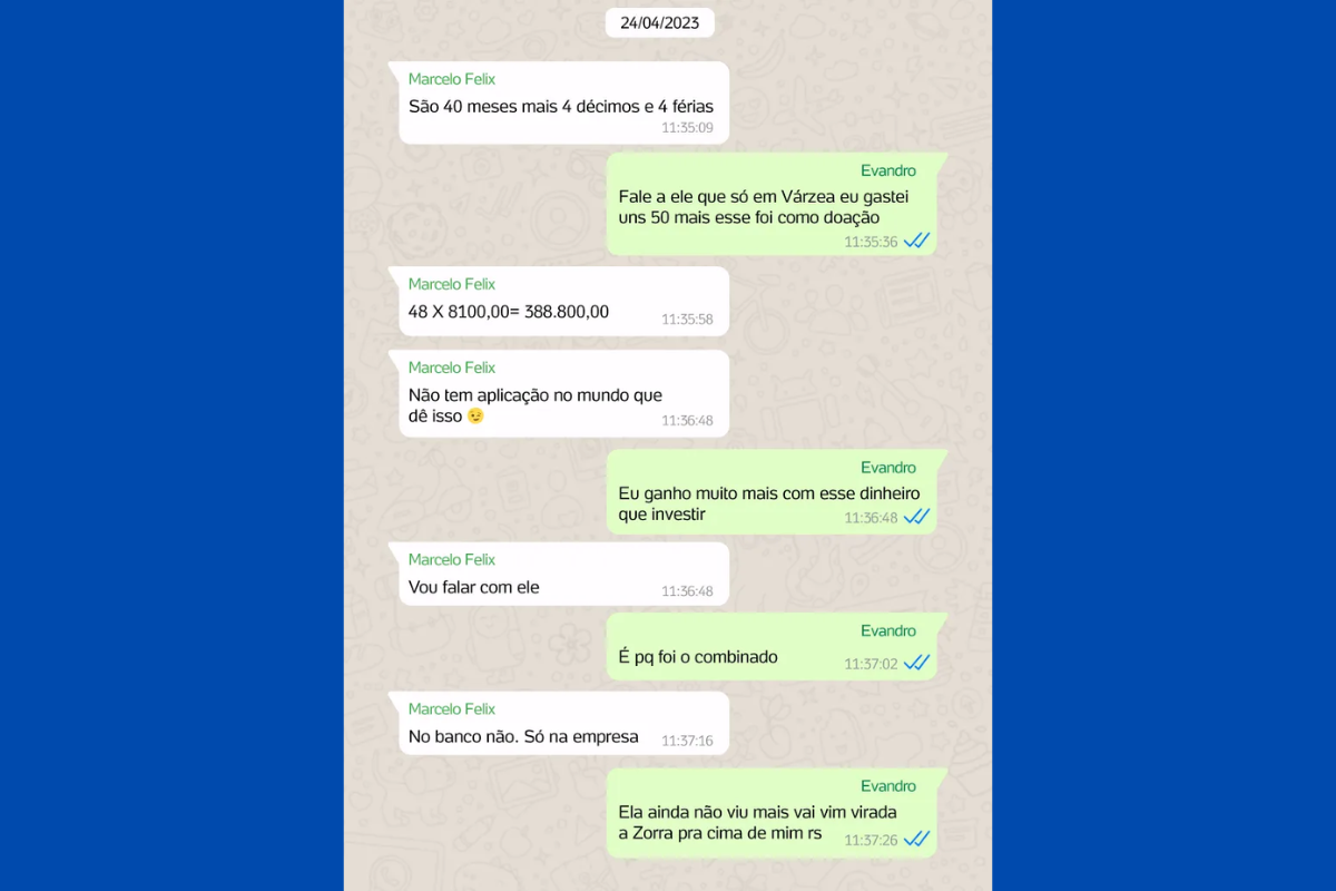 Em diversas ocasiões, entre 2023 e 2024, Marcelo pressiona Evandro e pede dinheiro. Nas eleições de 2024, por exemplo, Marcelo pede R$ 75 mil para Evandro. Em outubro de 2024, ele pede uma transferência via Pix no valor de R$ 20 mil, e Evandro afirma que conversariam no dia seguinte.